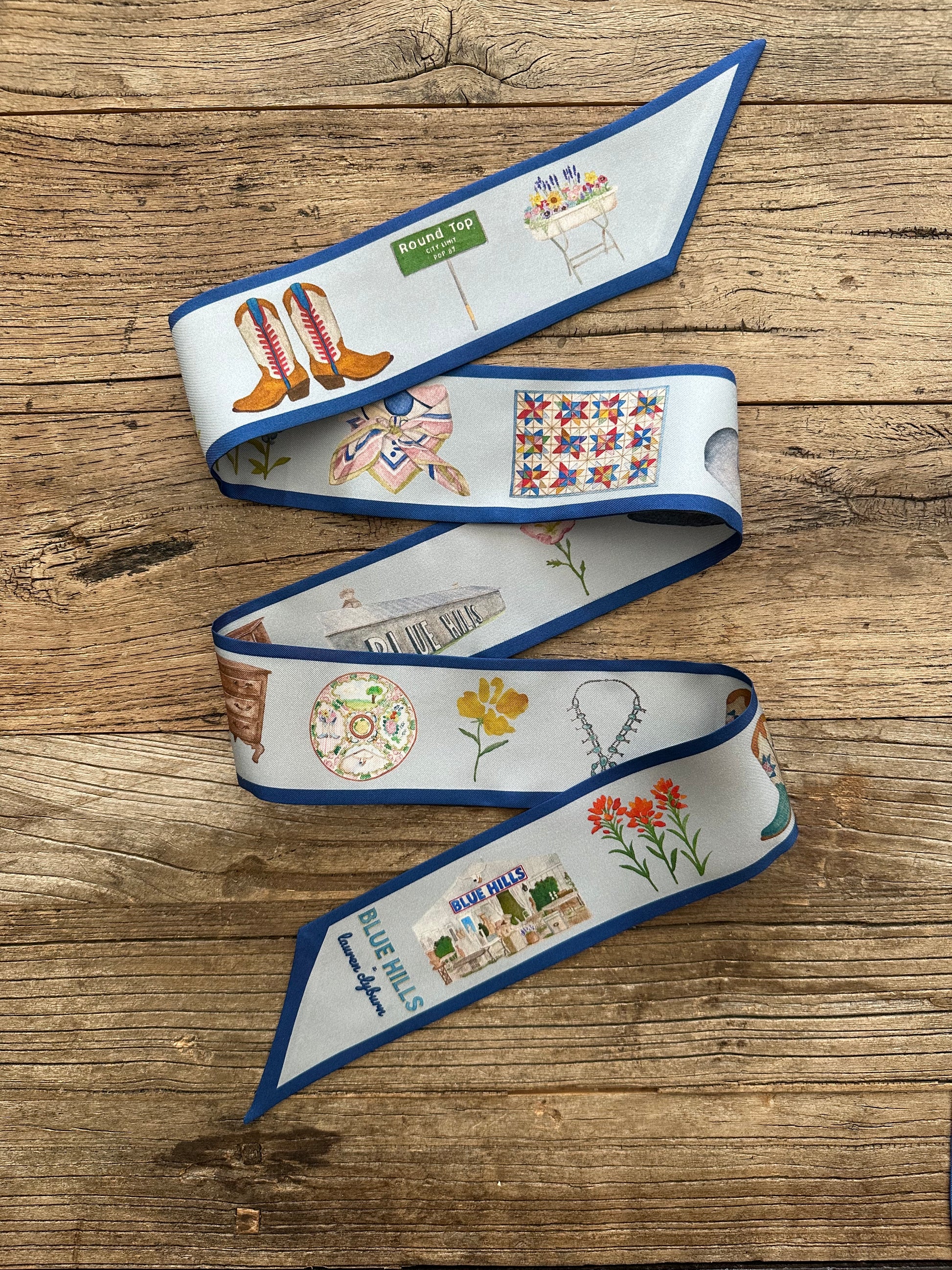 This custom art scarf is a keepsake to treasure, capturing the spirit of Round Top, Texas. Featuring the iconic Blue Hills and the details that make this town unforgettable, each piece is hand-painted in watercolor and designed by Lauren Clyburn.