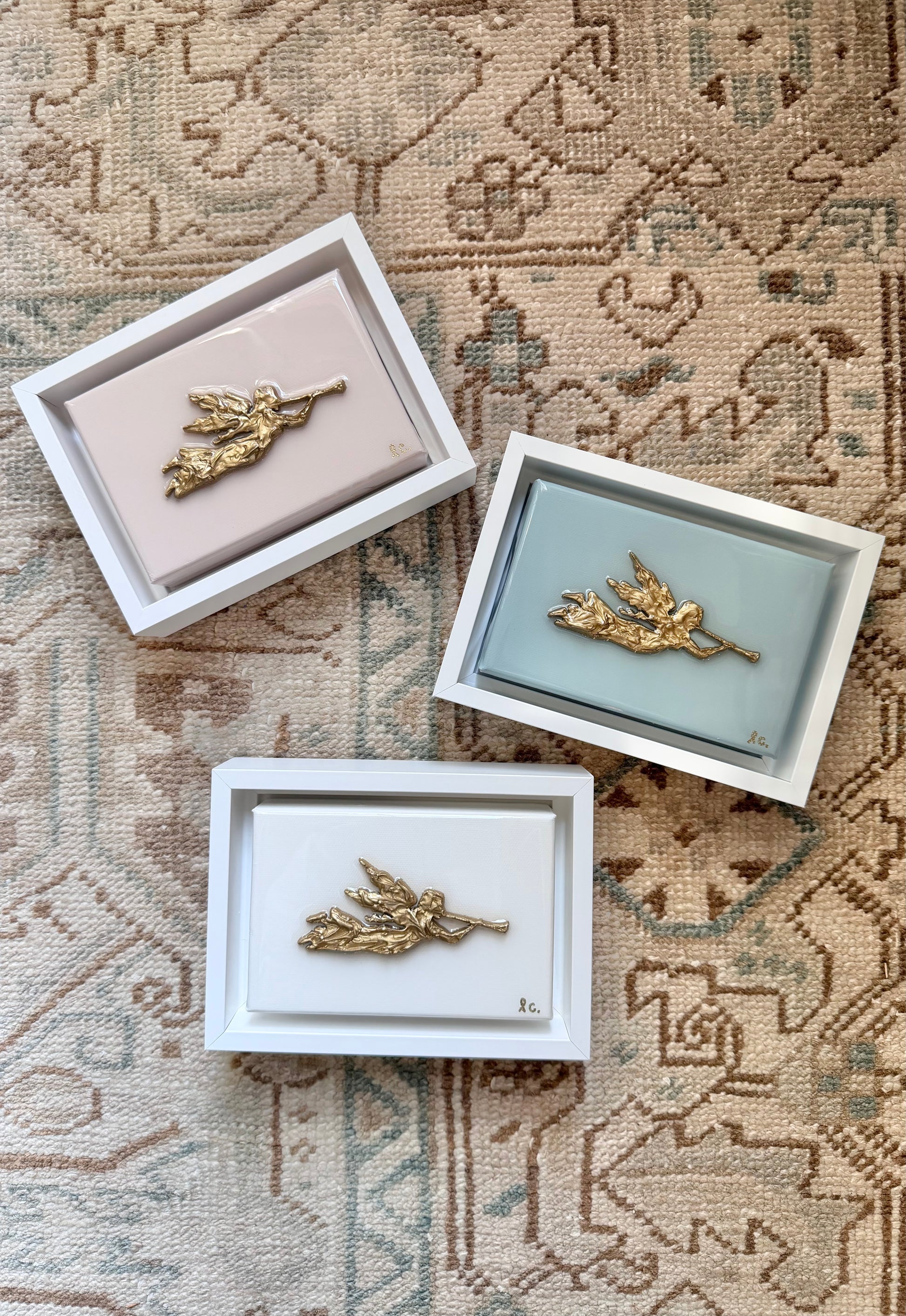 Gallery wrapped canvas measuring 4x6, with a gold-painted Christmas angel. Finished with a high gloss resin. Framed in an heirloom floating frame.