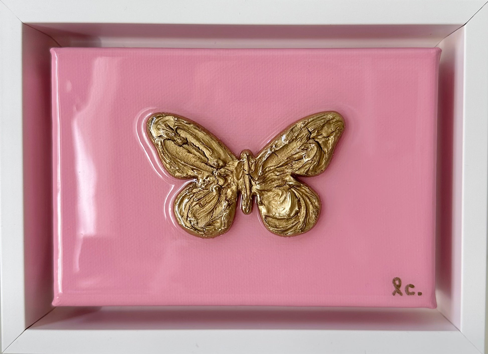 Gallery wrapped canvas measuring 4x6. Painted pink with a gold butterfly. Finished in a white wood floating frame.