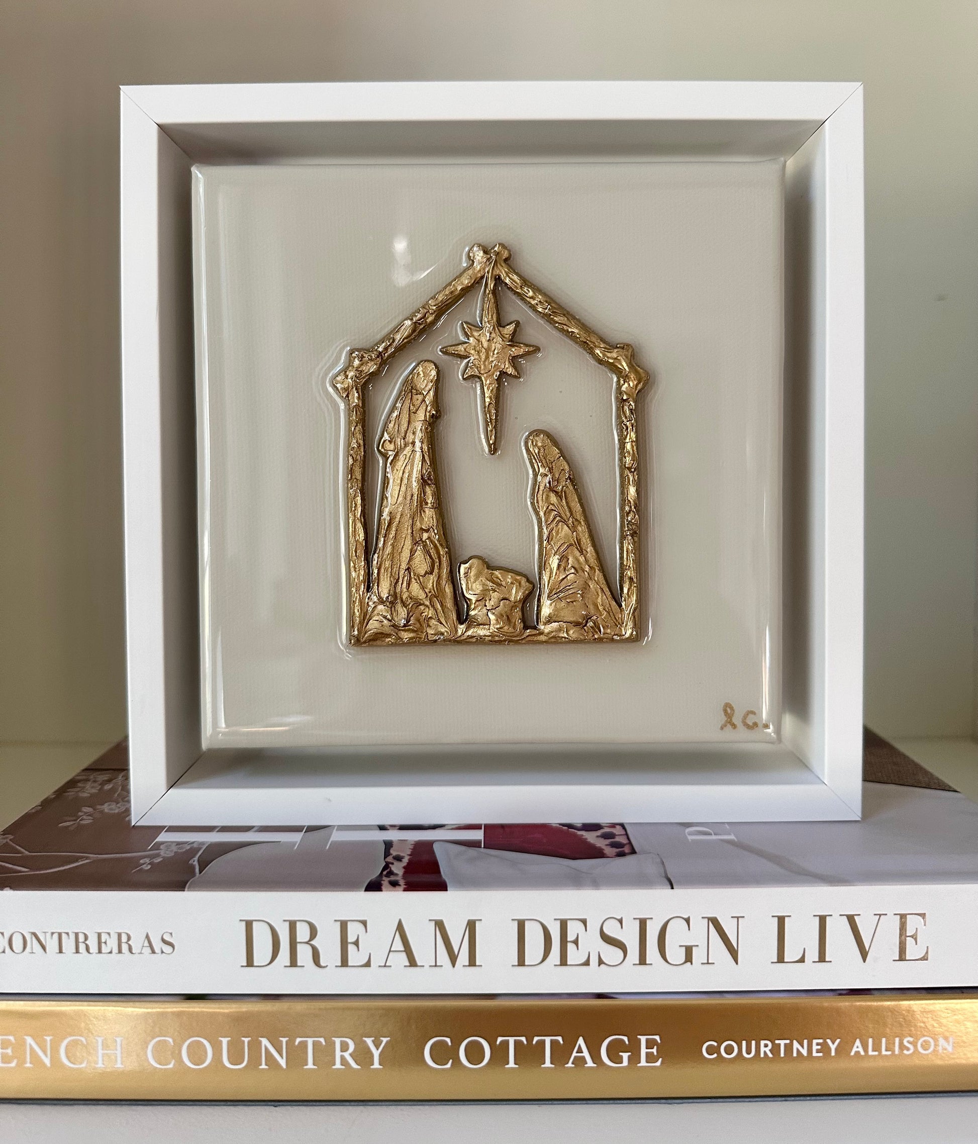 Gallery wrapped canvas measuring 6x6, painted greige with a gold-painted Nativity scene. Finished with a high gloss resin in a heirloom white wood floating frame.