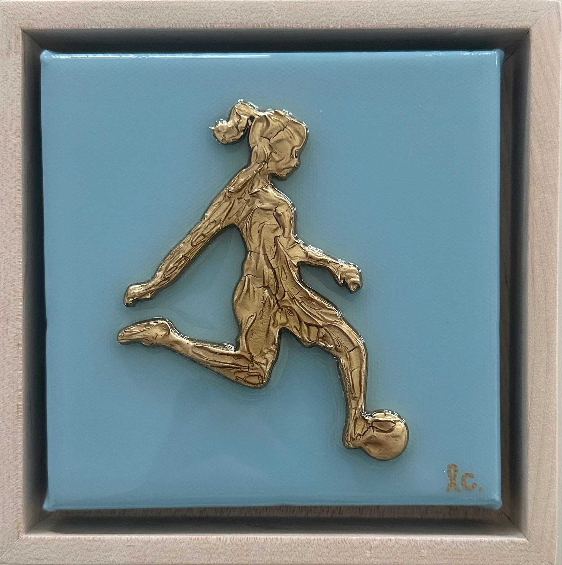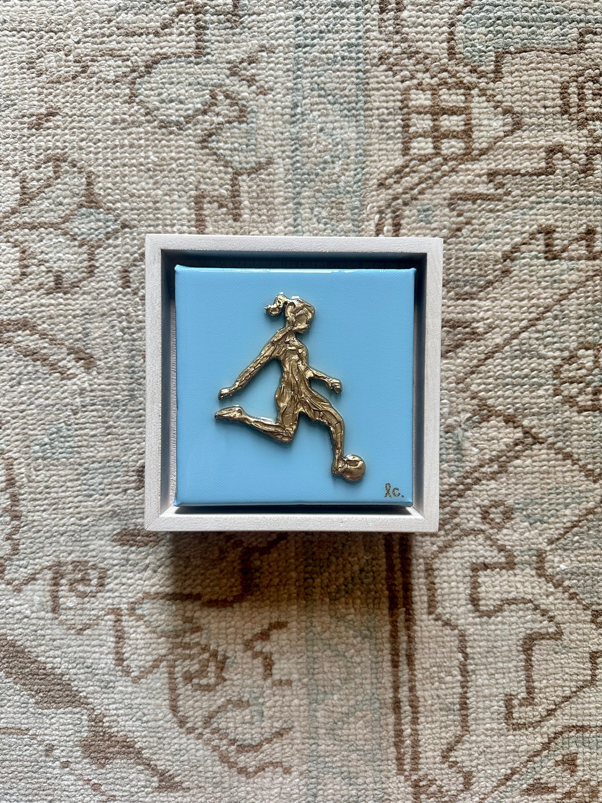 Gallery wrapped canvas measuring 5x5, painted blue with a gold-painted female soccer player. Framed in a maple wood heirloom floating frame.